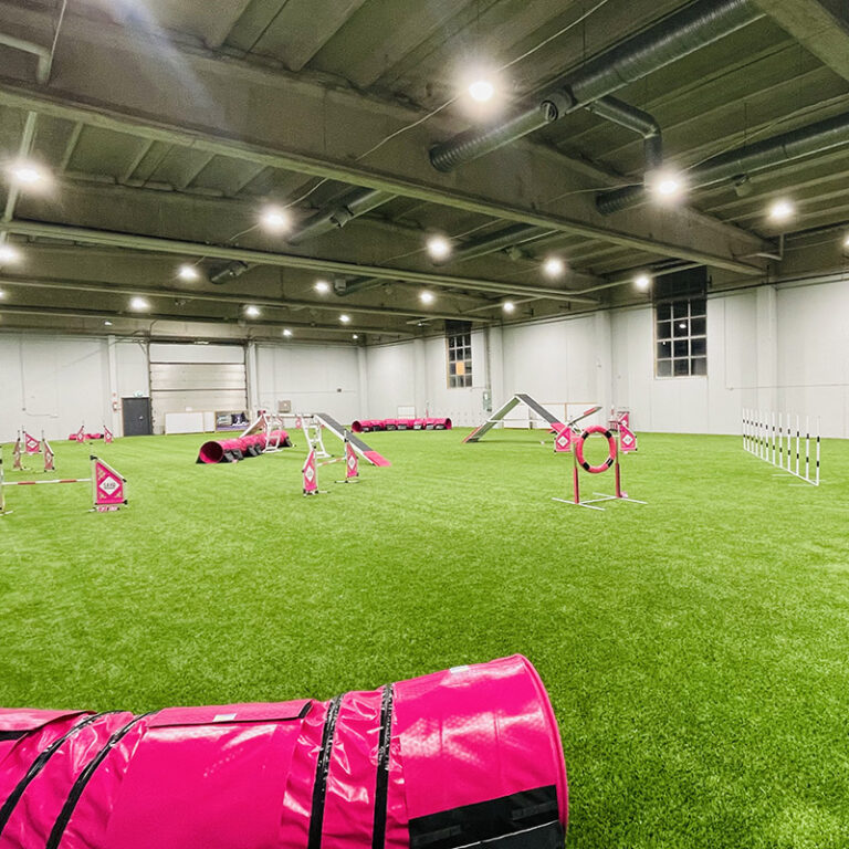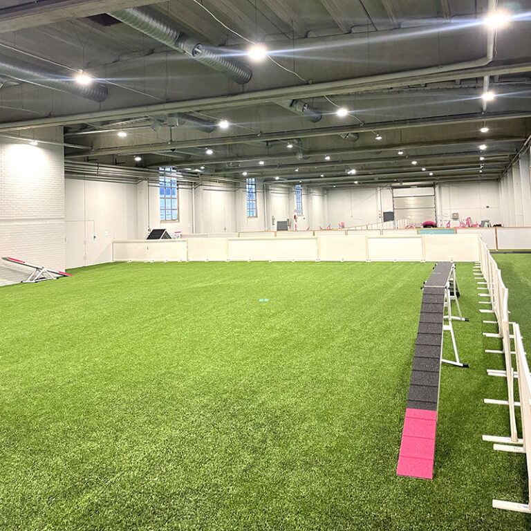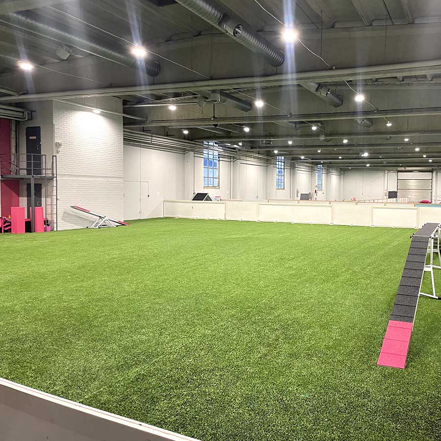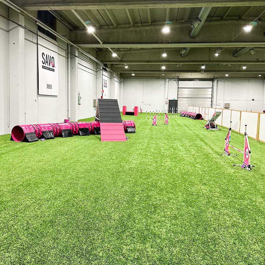 Alustana hallitilassa on laadukas Saltex 50mm tekonurmi kumirouhetäytöllä. Kisakäytössä halliin mahtuu jopa 50x20m kokoinen agilityn kilpailukenttä hallin kokonaispituuden ollessa 72 metriä. Tilaa halliin jää loistavasti siis myös esimerkiksi lämmittelyesteille, häkeille ja yleisölle. Hallitilassa on oma WC sekä sosiaalitilat keittiöllä. Hallitilassa tarkenee hyvin, ja lämpötila on säädetty talvisinkin karvakuonoille sopivaksi.